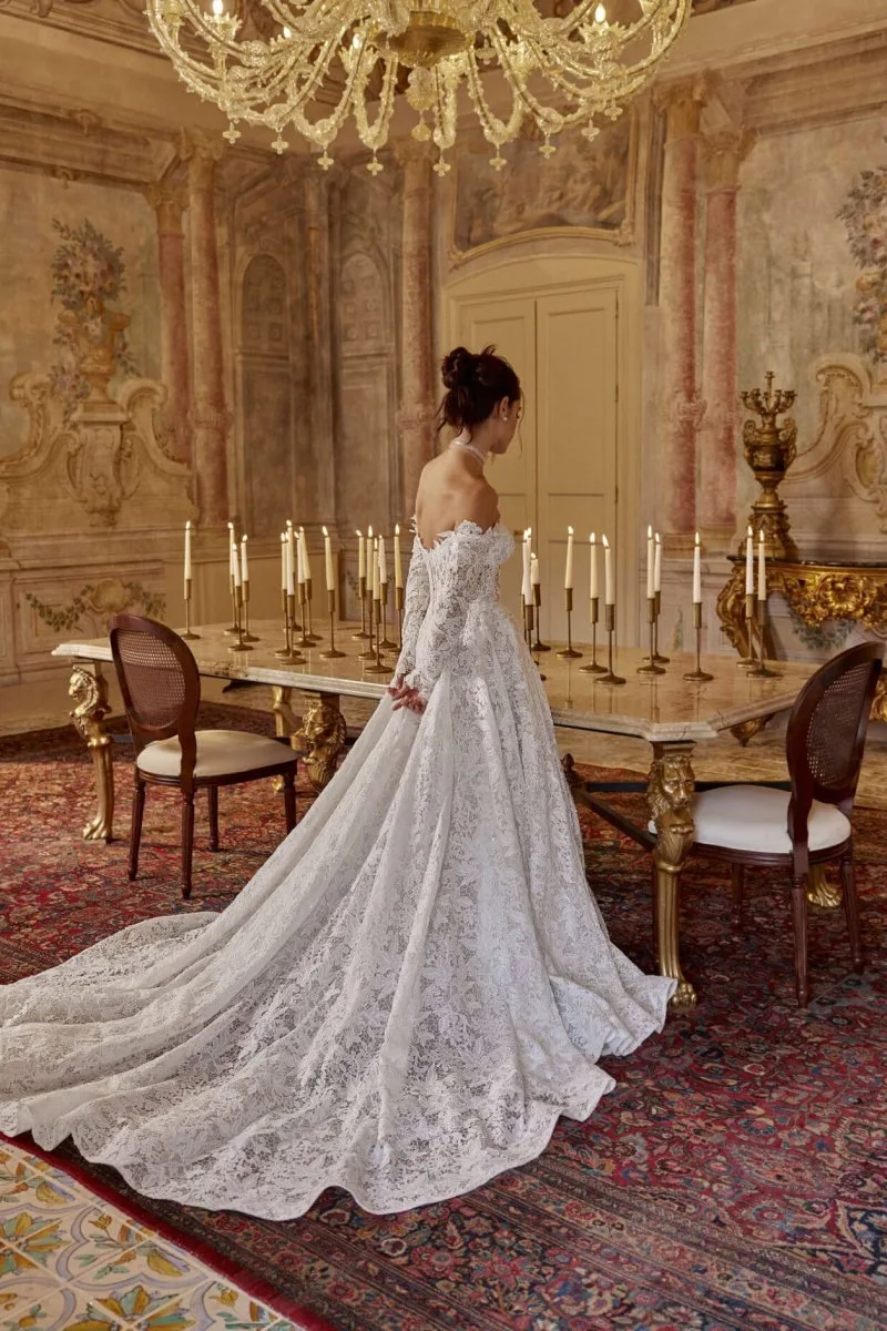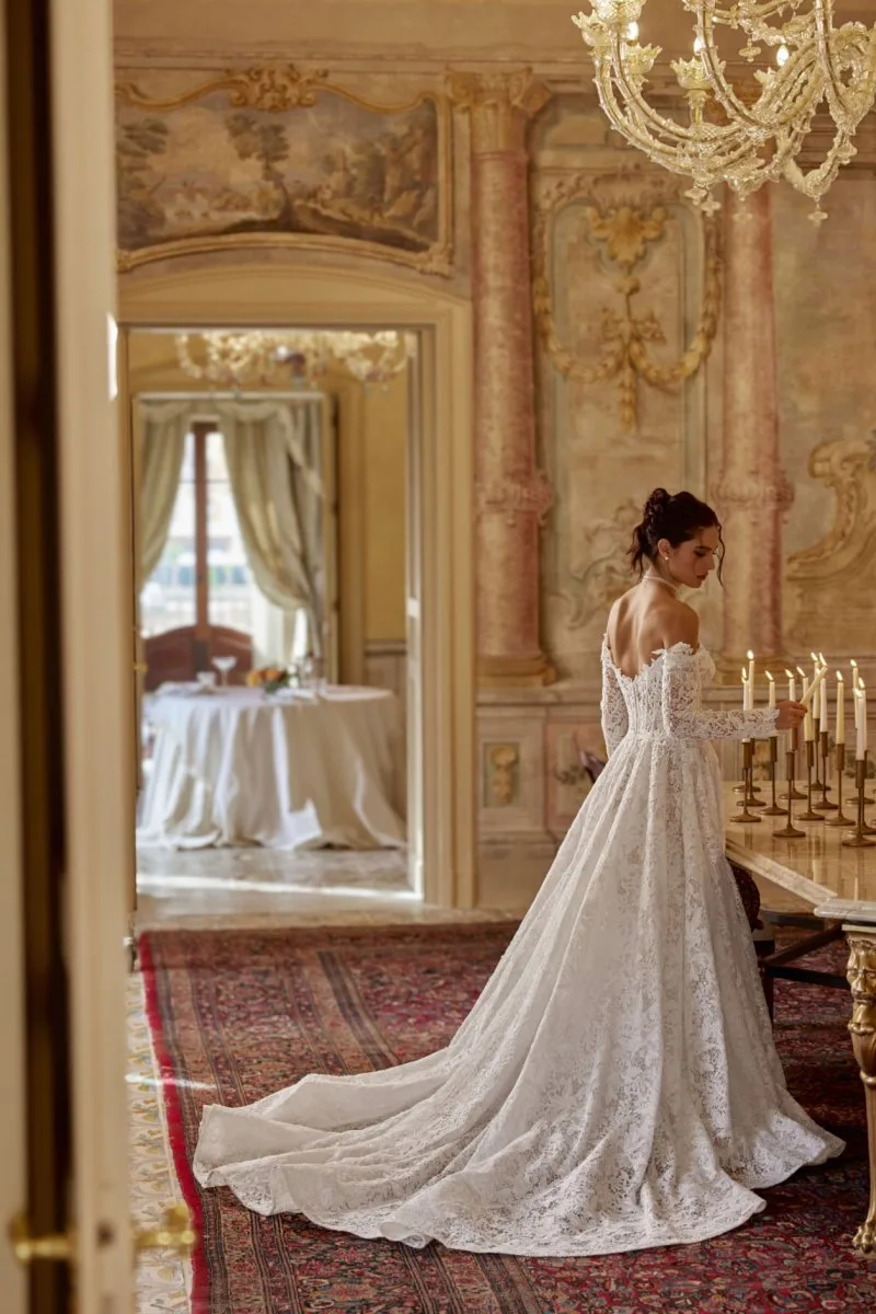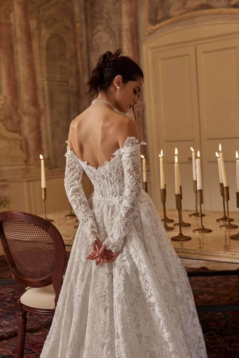 Свадебное платье ADEL А-силуэта. Лиф дополнен: корсетная посадка, цветочный декор. Из кружева. Особенности: шлейф. Модель с длинными рукавами. Доступные оттенки: пудровый. ADEL — свадебное платье от Rara Avis, коллекция My Dear Lady. Купить, взять напрокат или записаться на примерку — салон MonPari, Гродно.