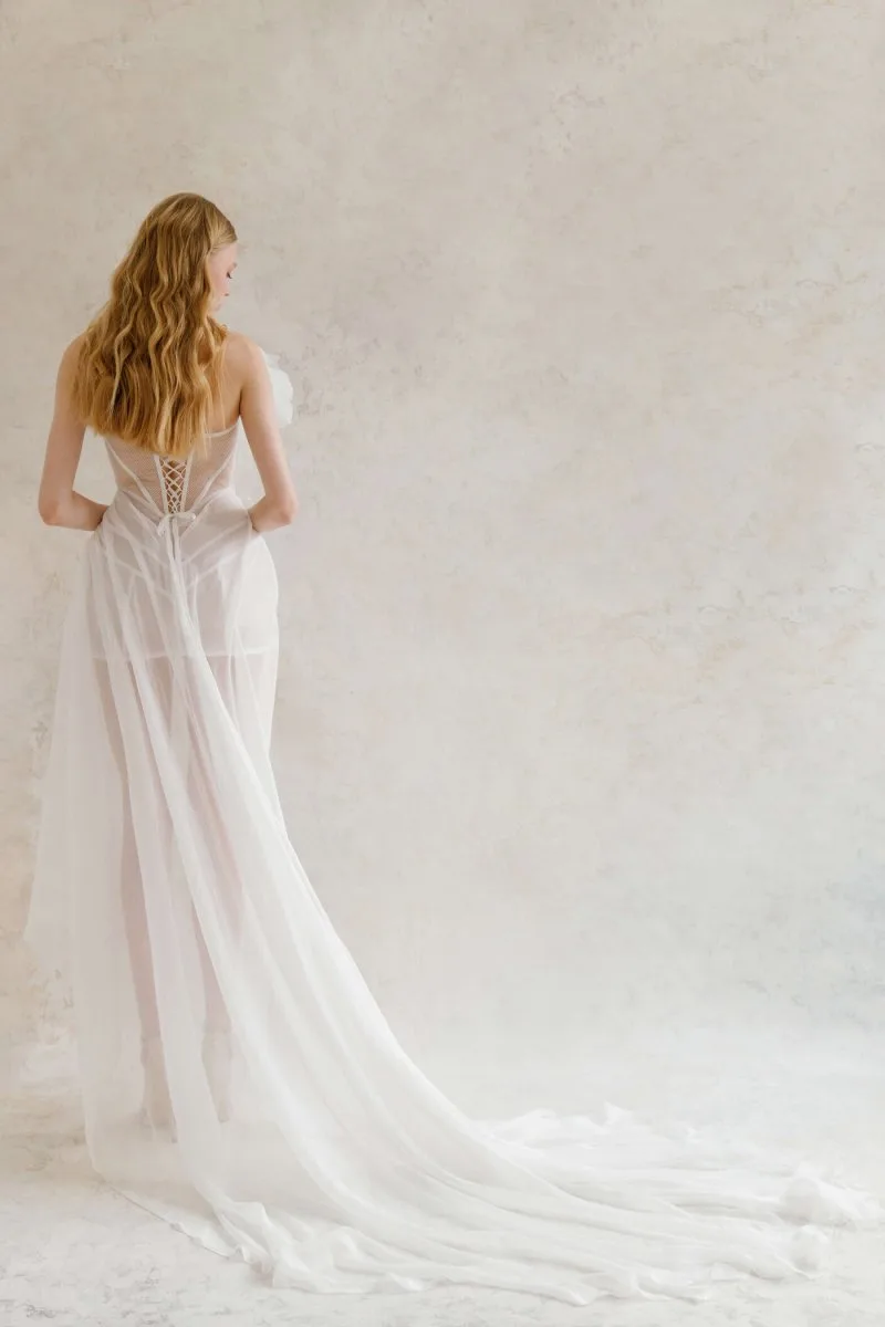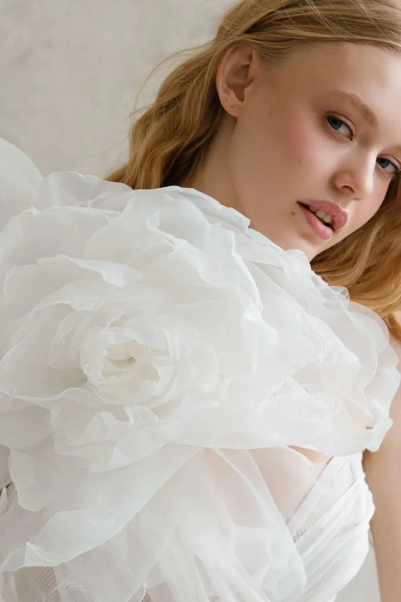 Свадебное платье ALUNIT мини. Лиф дополнен: цветочный декор. Объёмная юбка из шёлка. Особенности: шлейф. Доступные оттенки: молочный. ALUNIT — свадебное платье от Rara Couture, коллекция Ammonite. Купить, взять напрокат или записаться на примерку — салон MonPari, Гродно.