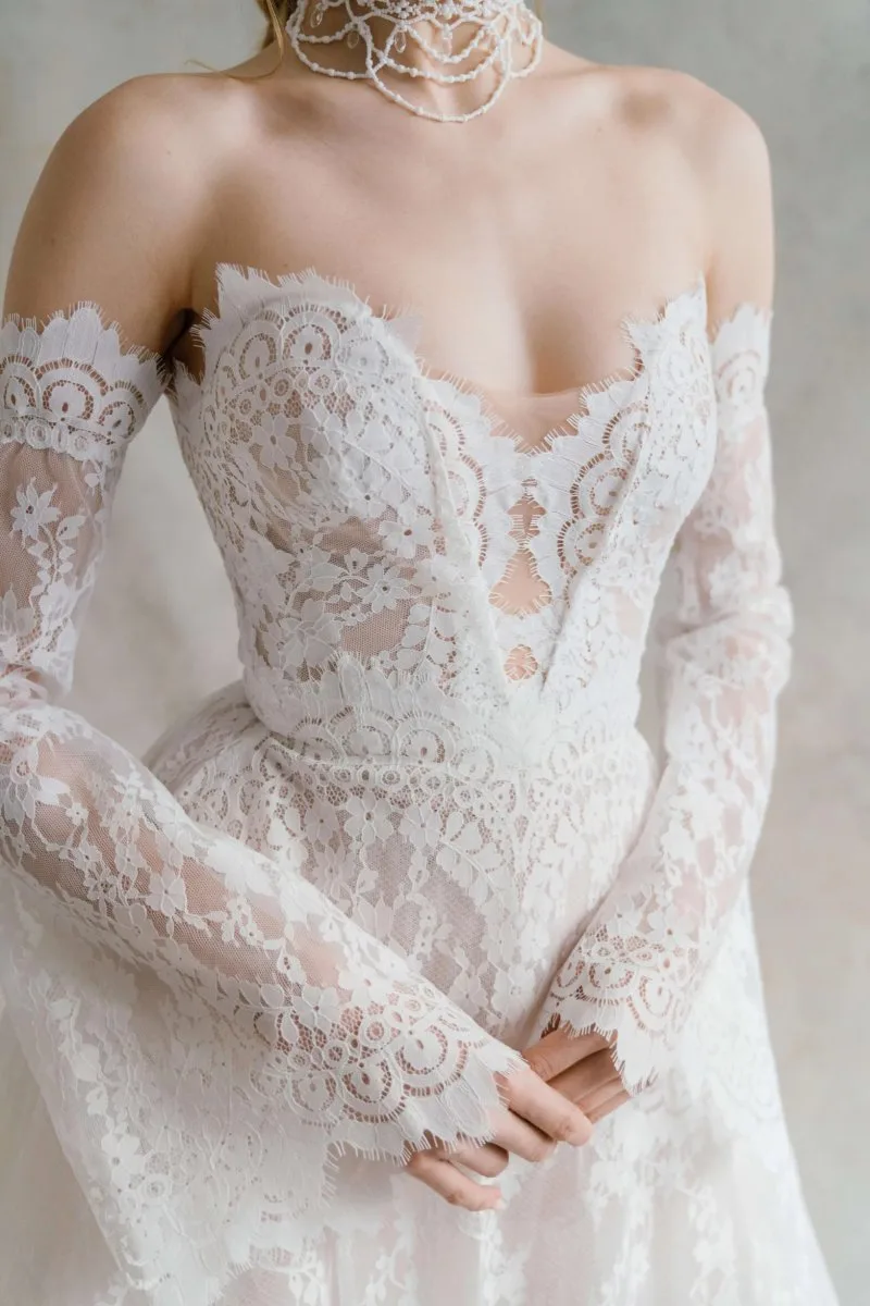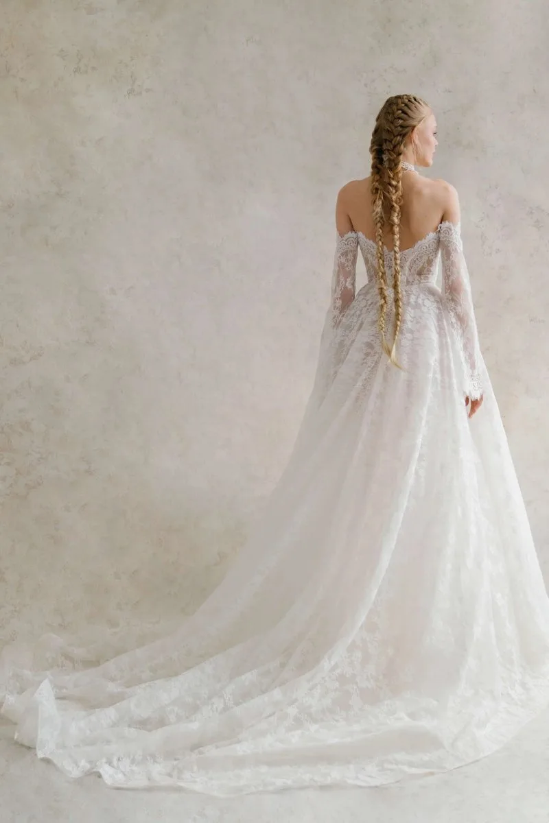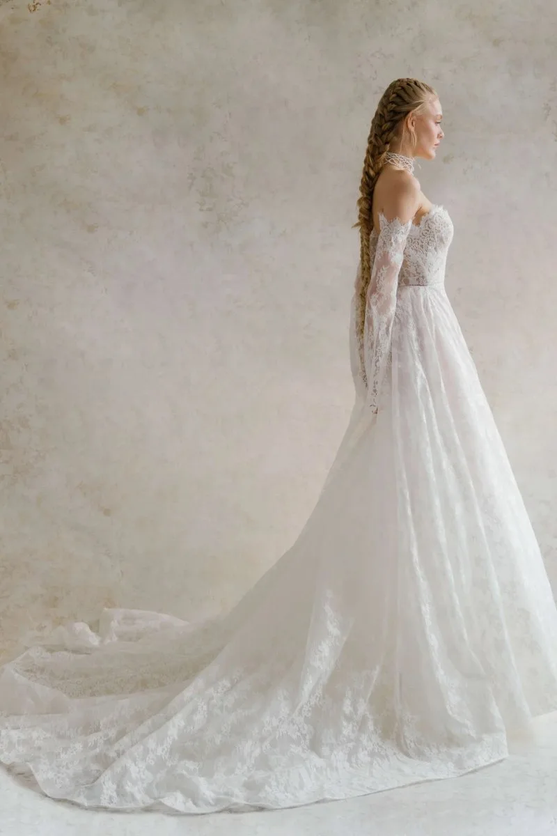Свадебное платье AMBER силуэта «принцесса». Из кружева. Особенности: шлейф. Модель с съёмными рукавами. Доступные оттенки: молочный. Ищете идеальное свадебное платье в Гродно? AMBER из коллекции Ammonite (Rara Couture) ждёт вас в салоне MonPari. Покупка и прокат.