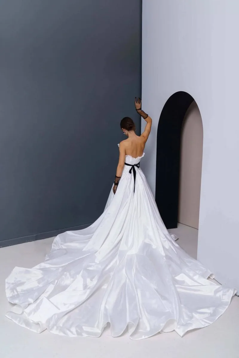 Свадебное платье ANIS А-силуэта. Лиф дополнен: формованные чашки, корсетная посадка. Из микадо с мерцающим блеском. Особенности: шлейф, разрез. Образ дополняют: декоративный бант, пояс. Доступные оттенки: молочный. ANIS — свадебное платье от Rara Avis, коллекция Amore Mio. Купить, взять напрокат или записаться на примерку — салон MonPari, Гродно.