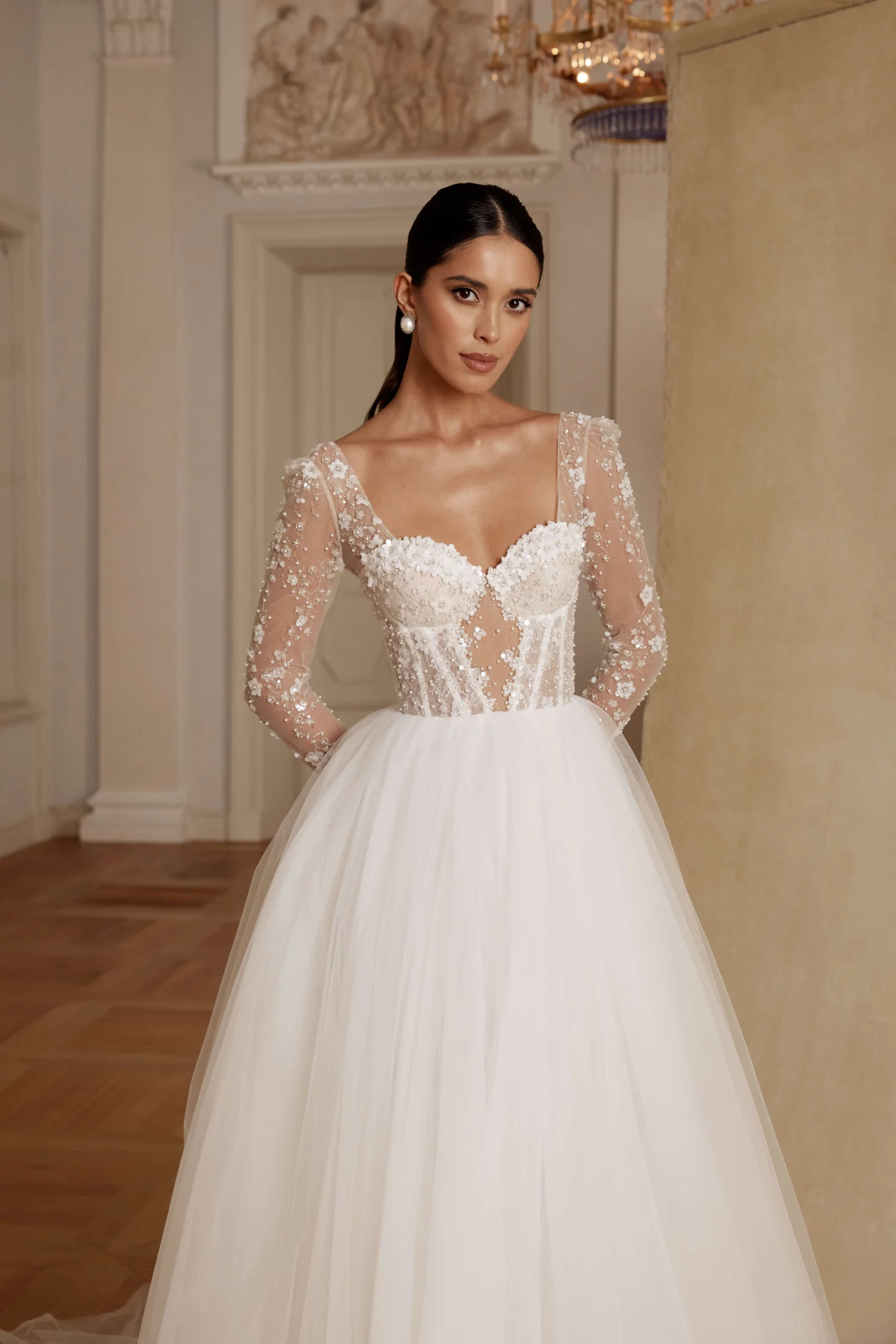 Свадебное платье AZA силуэта «принцесса». Лиф дополнен: корсетная посадка, вышивка. Многослойная юбка из сетки. Особенности: шлейф. Модель с съёмными рукавами. Доступные оттенки: молочный. Платье AZA от Blamme Biamo (коллекция Your Indentity) можно купить, взять напрокат или примерить в салоне MonPari, Гродно.