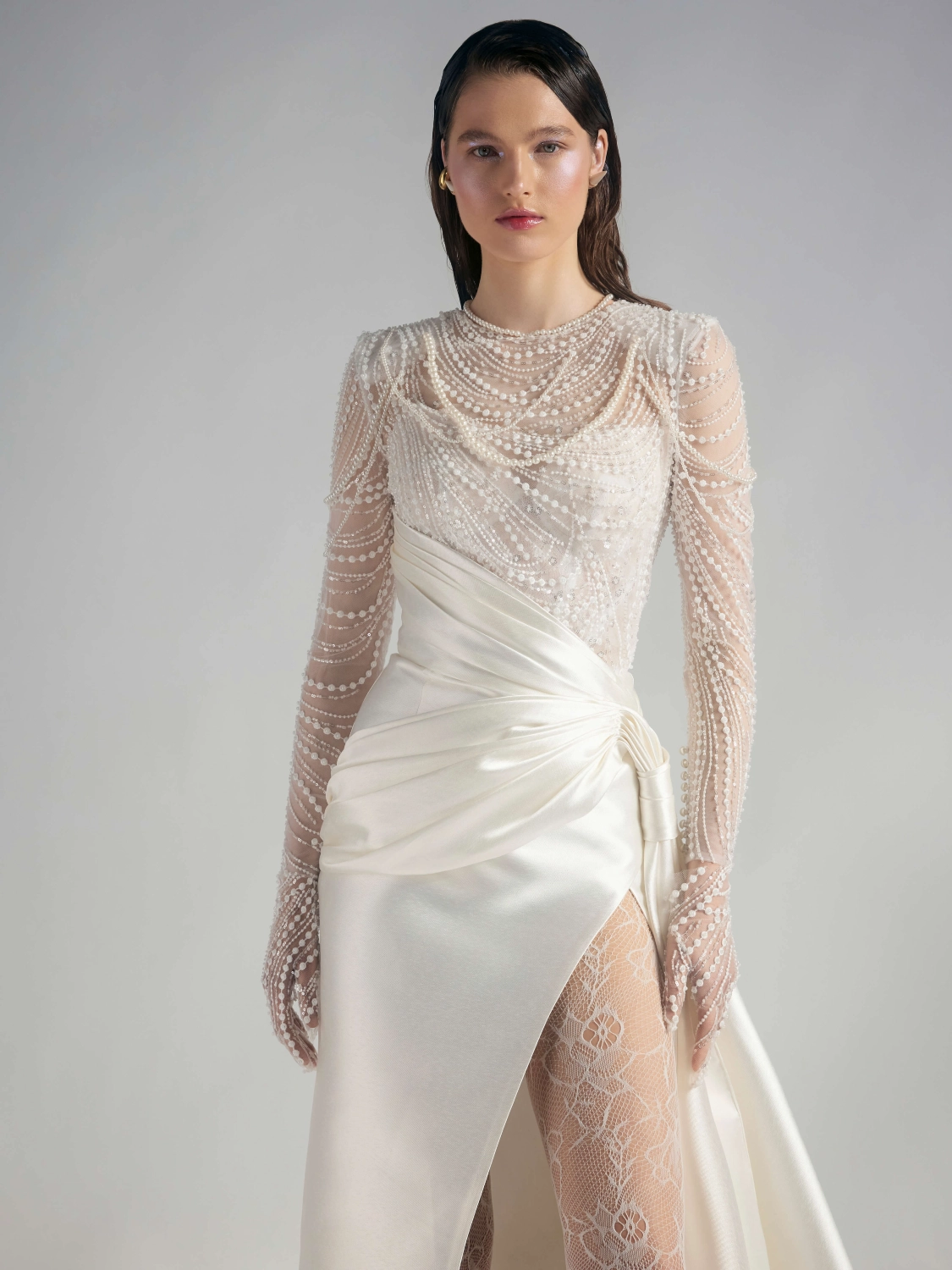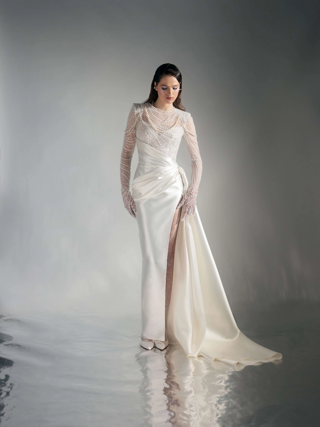 Свадебное платье CAPRICORN прямого кроя. Лиф дополнен: корсетная посадка, драпировка. Из кружева и микадо. Особенности: шлейф, разрез. Модель с длинными рукавами. Доступные оттенки: кремовый. Свадебное платье CAPRICORN из коллекции L'horoscope от Rara Couture доступно для покупки, проката и примерки в салоне MonPari в Гродно.