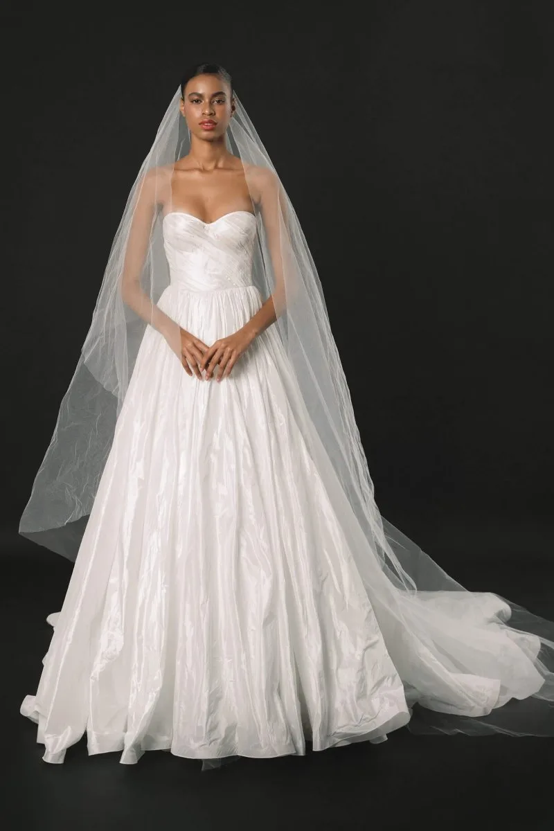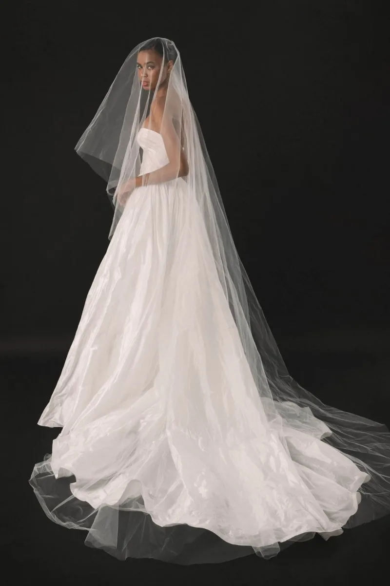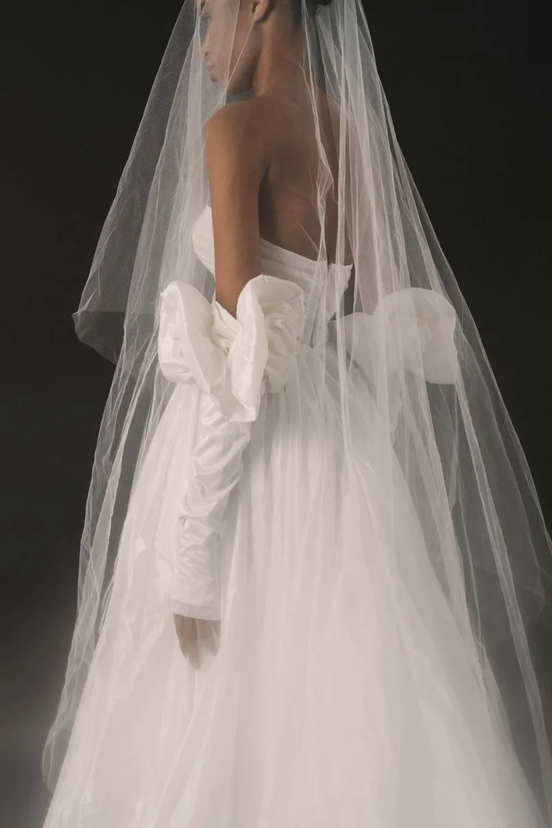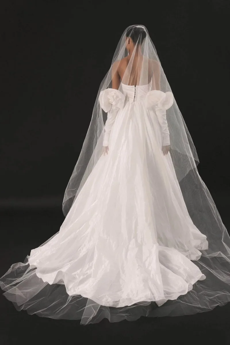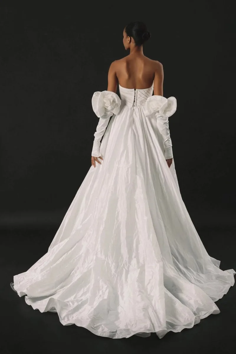 Свадебное платье ENLIL А-силуэта. Лиф дополнен: корсетная посадка. Из тафты. Особенности: шлейф. Модель с съёмными рукавами. Доступные оттенки: молочный. ENLIL — свадебное платье от Rara Couture, коллекция Rose Des Vents. Купить, взять напрокат или записаться на примерку — салон MonPari, Гродно.