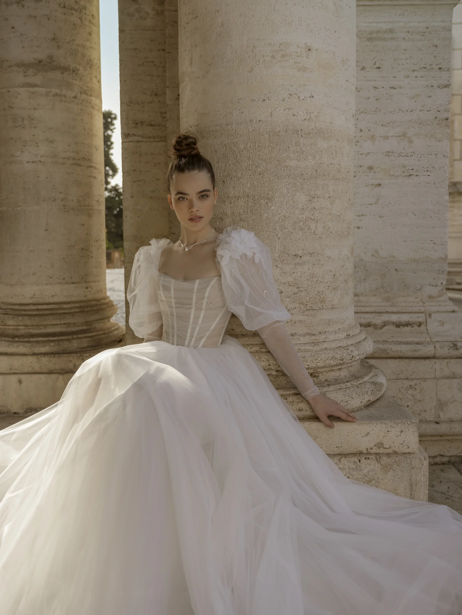 Свадебное платье EVLALIA силуэта «принцесса». Лиф дополнен: корсетная посадка, драпировка, цветочный декор. Многослойная юбка из сетки. Особенности: шлейф. Доступные оттенки: молочный. Ищете идеальное свадебное платье в Гродно? EVLALIA из коллекции Harmony of Love (Blamme Biamo) ждёт вас в салоне MonPari. Покупка и прокат.
