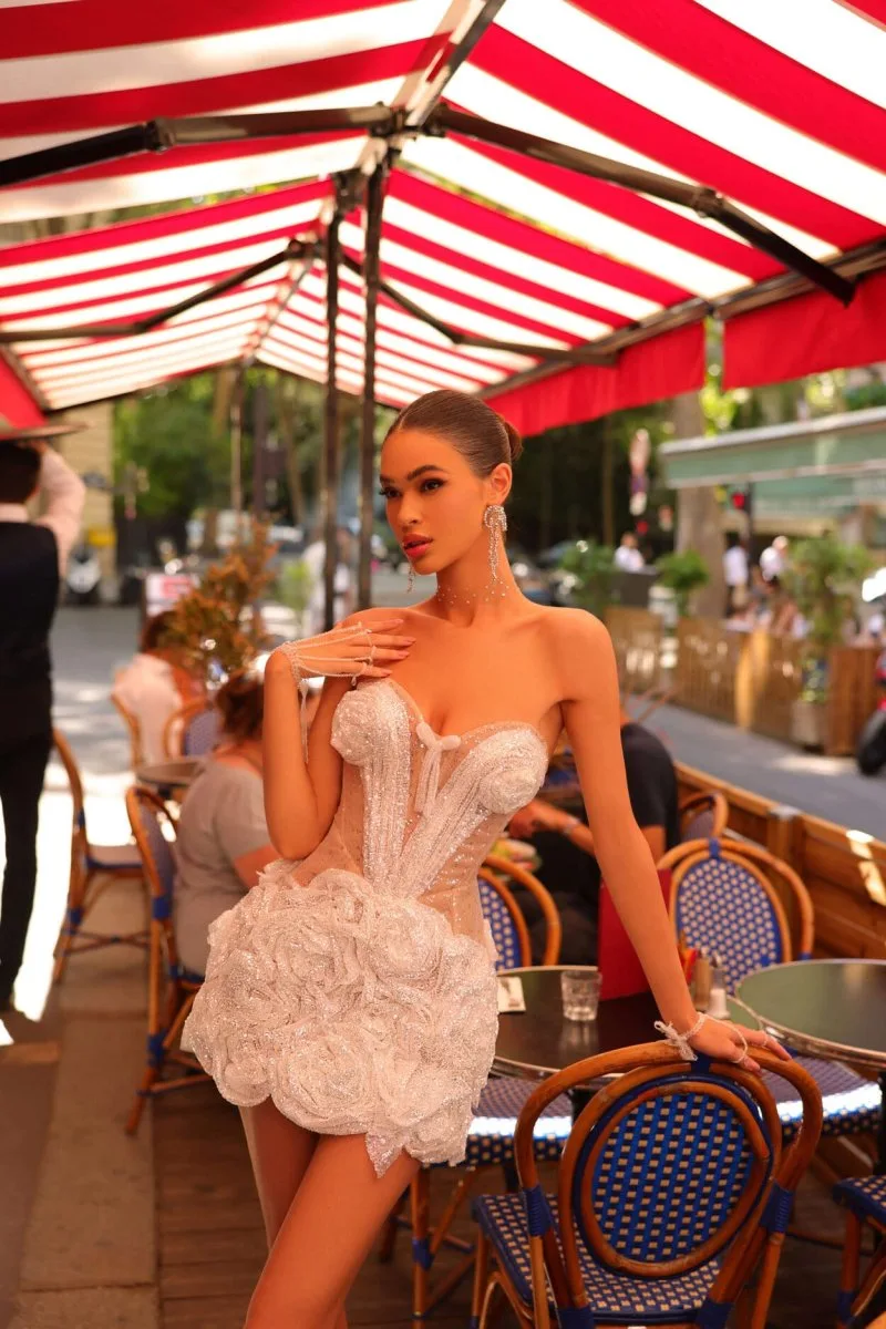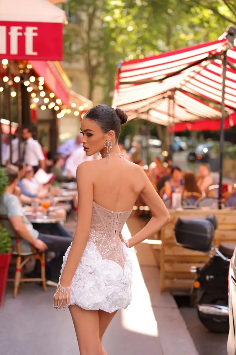 Свадебное платье FIANIT мини. Лиф дополнен: вышивка, пайетки. Из кружева с мерцающим блеском. Доступные оттенки: молочный. FIANIT — свадебное платье от Rara Avis, коллекция Il Mio Diamante. Купить, взять напрокат или записаться на примерку — салон MonPari, Гродно.