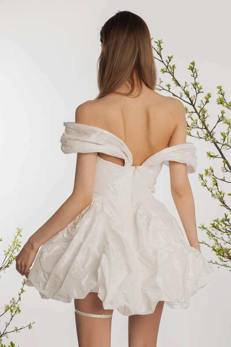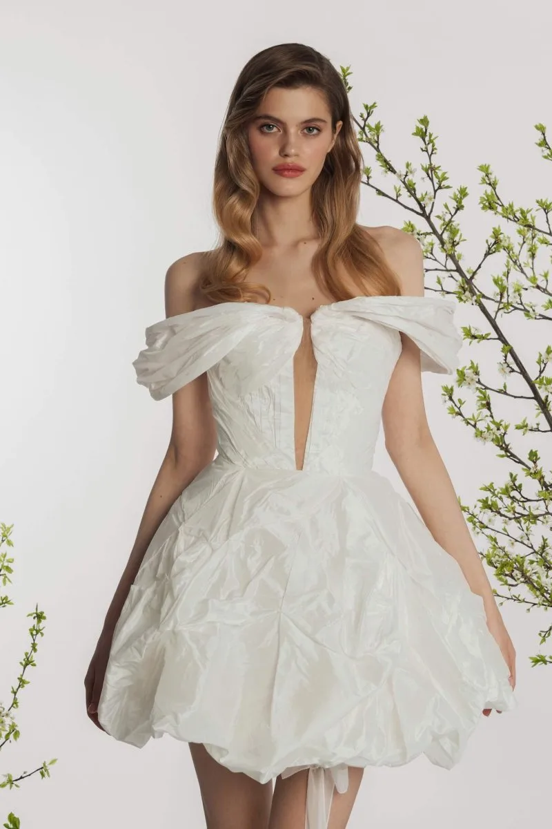 Свадебное платье IRIFI мини. Лиф дополнен: формованные чашки, корсетная посадка, драпировка. Объёмная юбка из тафты. Доступные оттенки: молочный. Платье IRIFI от Rara Couture (коллекция Rose Des Vents) можно купить, взять напрокат или примерить в салоне MonPari, Гродно.