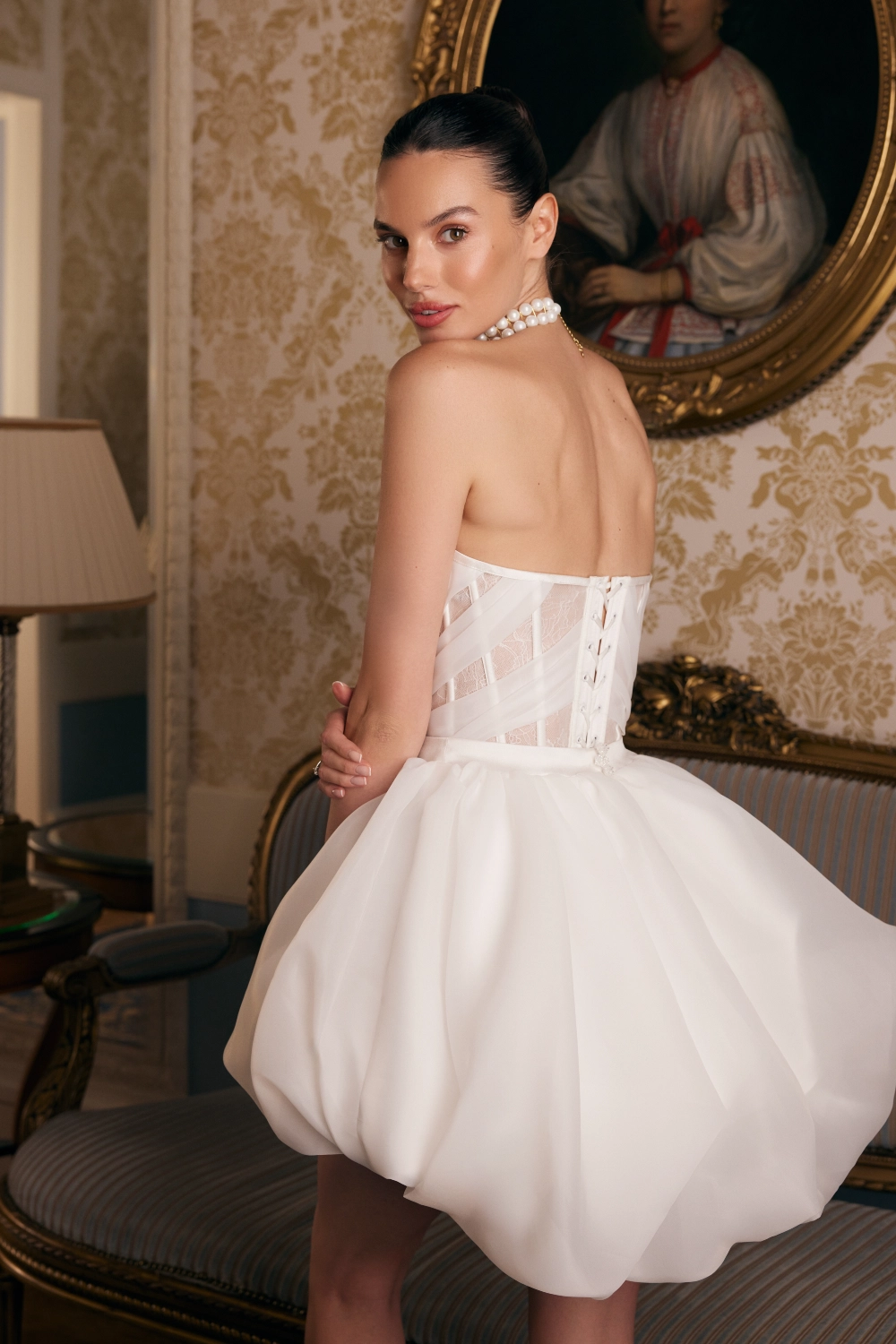 Свадебное платье KSILIA mini мини. Лиф дополнен: корсетная посадка, драпировка, цветочный декор, кружевная аппликация. Объёмная юбка из комбинированных тканей. Образ дополняют: кейп. Доступные оттенки: молочный. Платье KSILIA mini от Blamme Biamo (коллекция Raise Your Wings) можно купить, взять напрокат или примерить в салоне MonPari, Гродно.