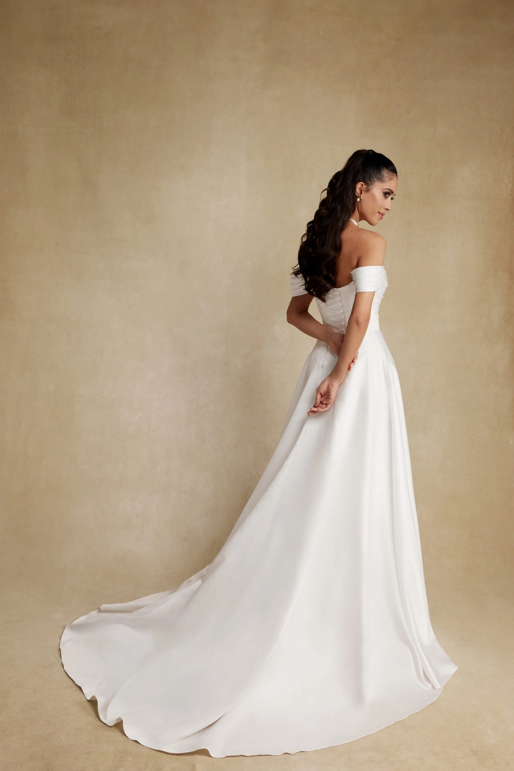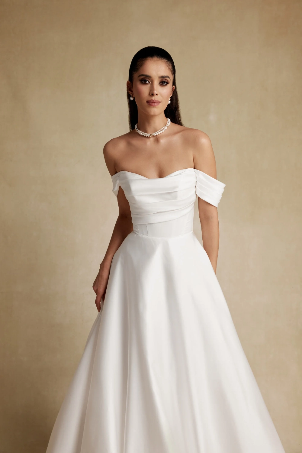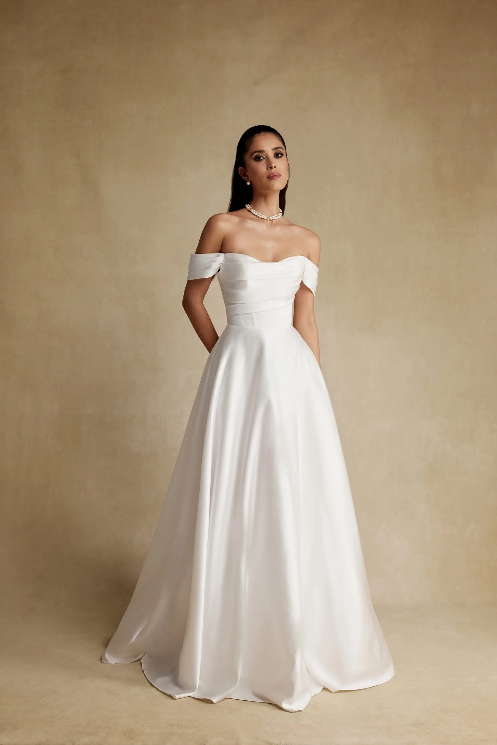 Свадебное платье LAFIA А-силуэта. Лиф дополнен: корсетная посадка, драпировка. Из атласа. Особенности: шлейф. Модель с длинными рукавами. Доступные оттенки: молочный. LAFIA — свадебное платье от Blamme Biamo, коллекция Your Indentity. Купить, взять напрокат или записаться на примерку — салон MonPari, Гродно.