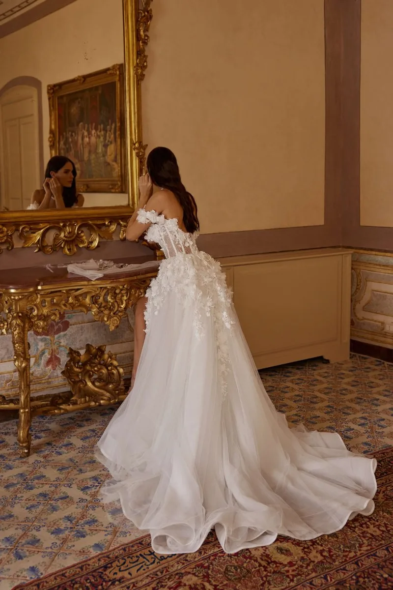Свадебное платье LIZA А-силуэта. Лиф дополнен: корсетная посадка, цветочный декор. Из комбинированных тканей. Особенности: шлейф, разрез. Доступные оттенки: молочный. Платье LIZA от Rara Avis (коллекция My Dear Lady) можно купить, взять напрокат или примерить в салоне MonPari, Гродно.