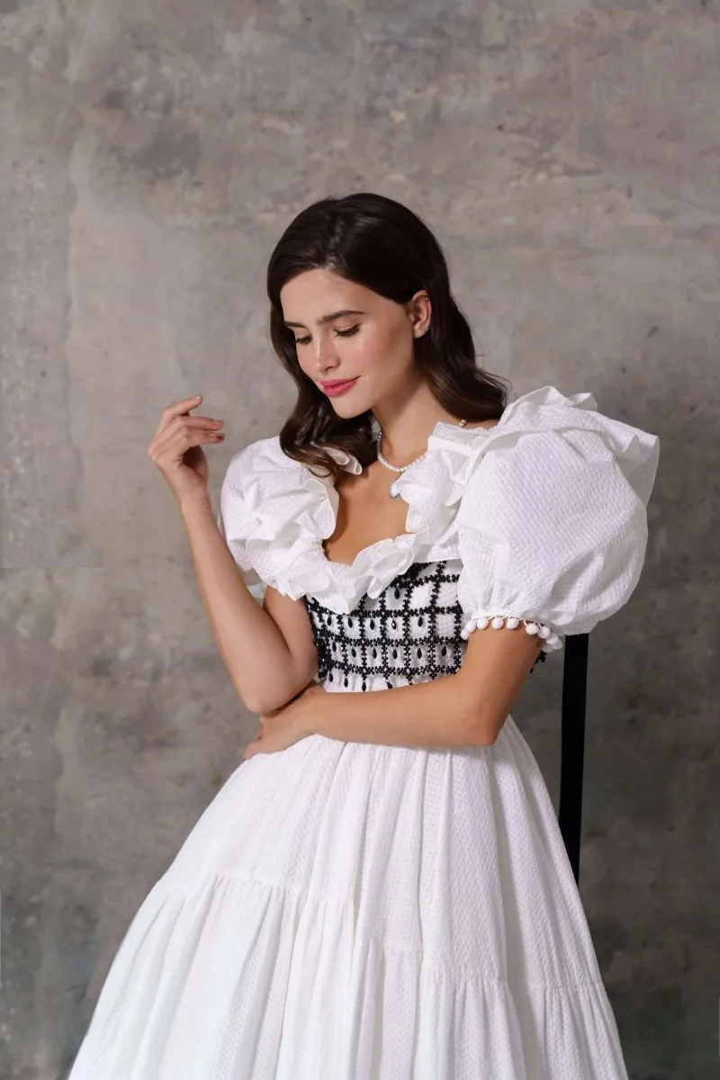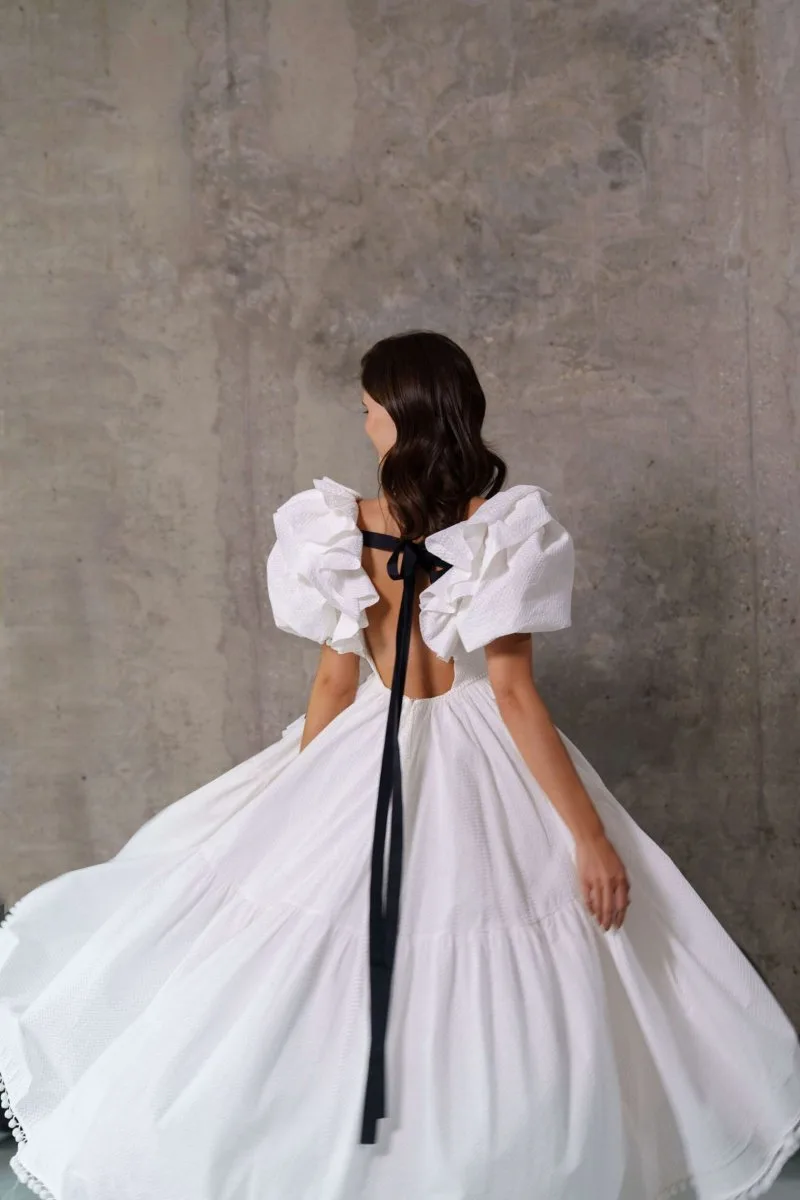 Свадебное платье MIRYEMA миди. Спинка: открытая спиная. Объёмная юбка из микадо. Доступные оттенки: молочный. Ищете идеальное свадебное платье в Гродно? MIRYEMA из коллекции Amore Mio (Rara Avis) ждёт вас в салоне MonPari. Покупка и прокат.