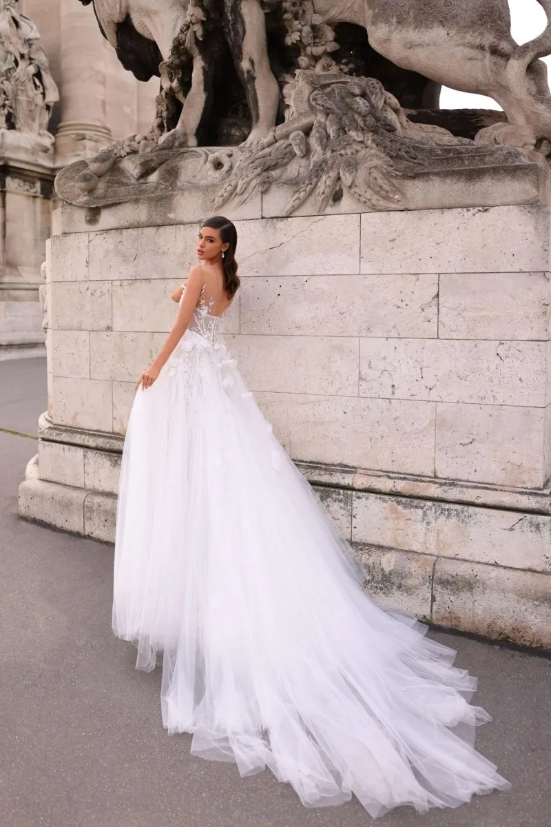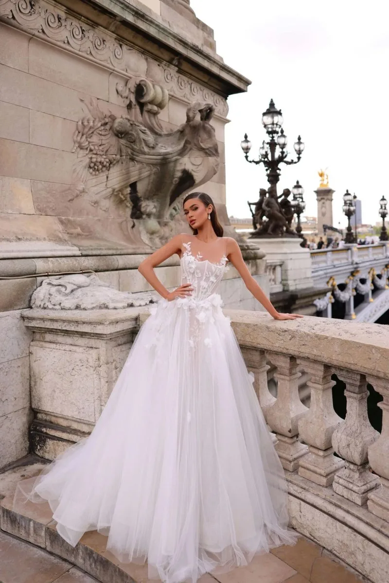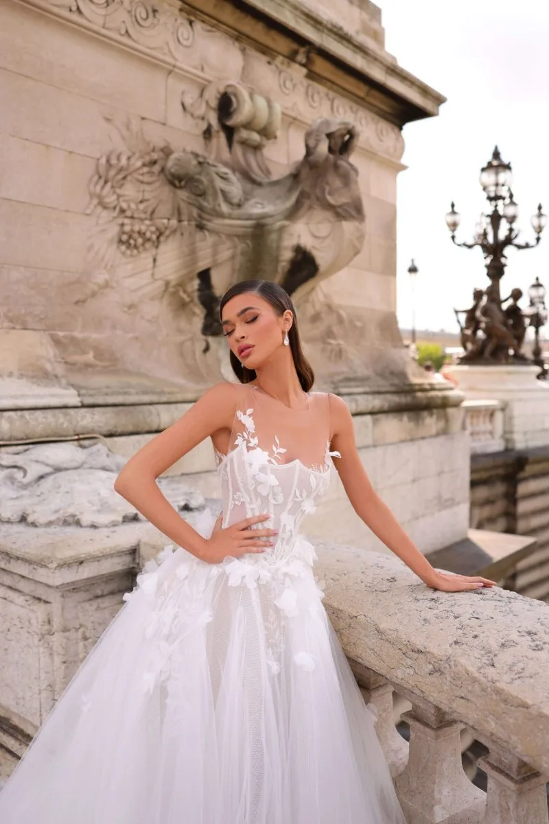 Свадебное платье NEFRIT силуэта «принцесса». Лиф дополнен: цветочный декор, отделка бисером и жемчугом. Из сетка. Особенности: шлейф. Доступные оттенки: молочный. Платье NEFRIT от Rara Avis (коллекция Il Mio Diamante) можно купить, взять напрокат или примерить в салоне MonPari, Гродно.
