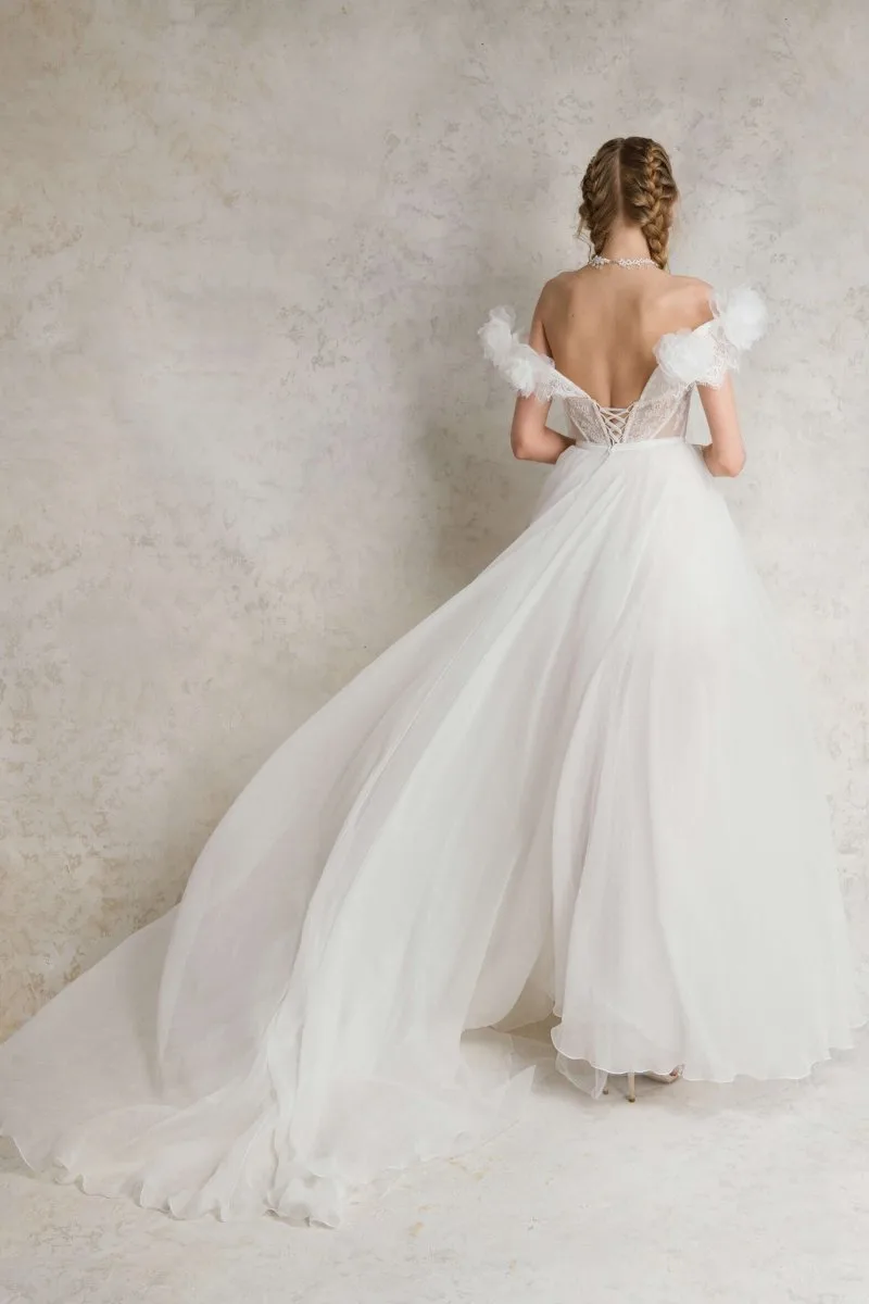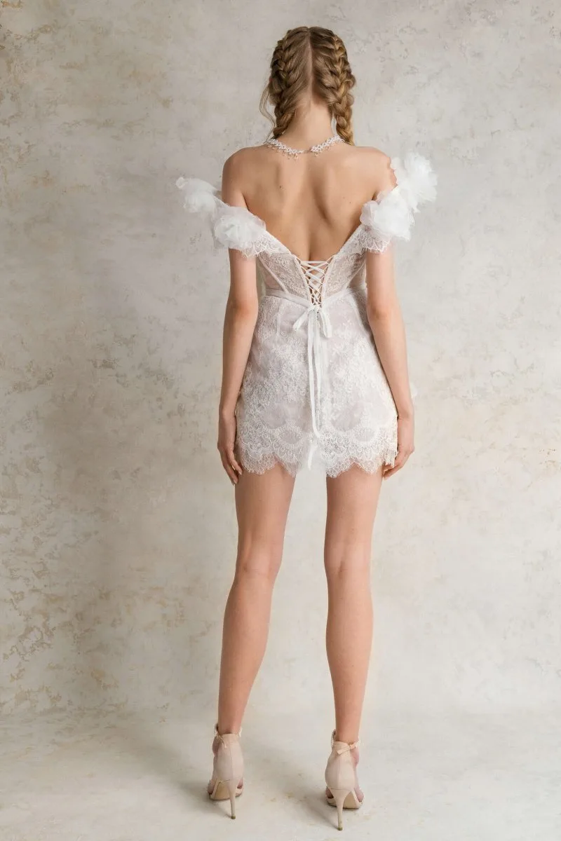 Свадебное платье ONYX мини. Лиф дополнен: цветочный декор. Из кружева. Доступные оттенки: молочный. Примерьте свадебное платье ONYX (Rara Couture, коллекция Ammonite) в свадебном салоне MonPari в Гродно. Доступна покупка и прокат.