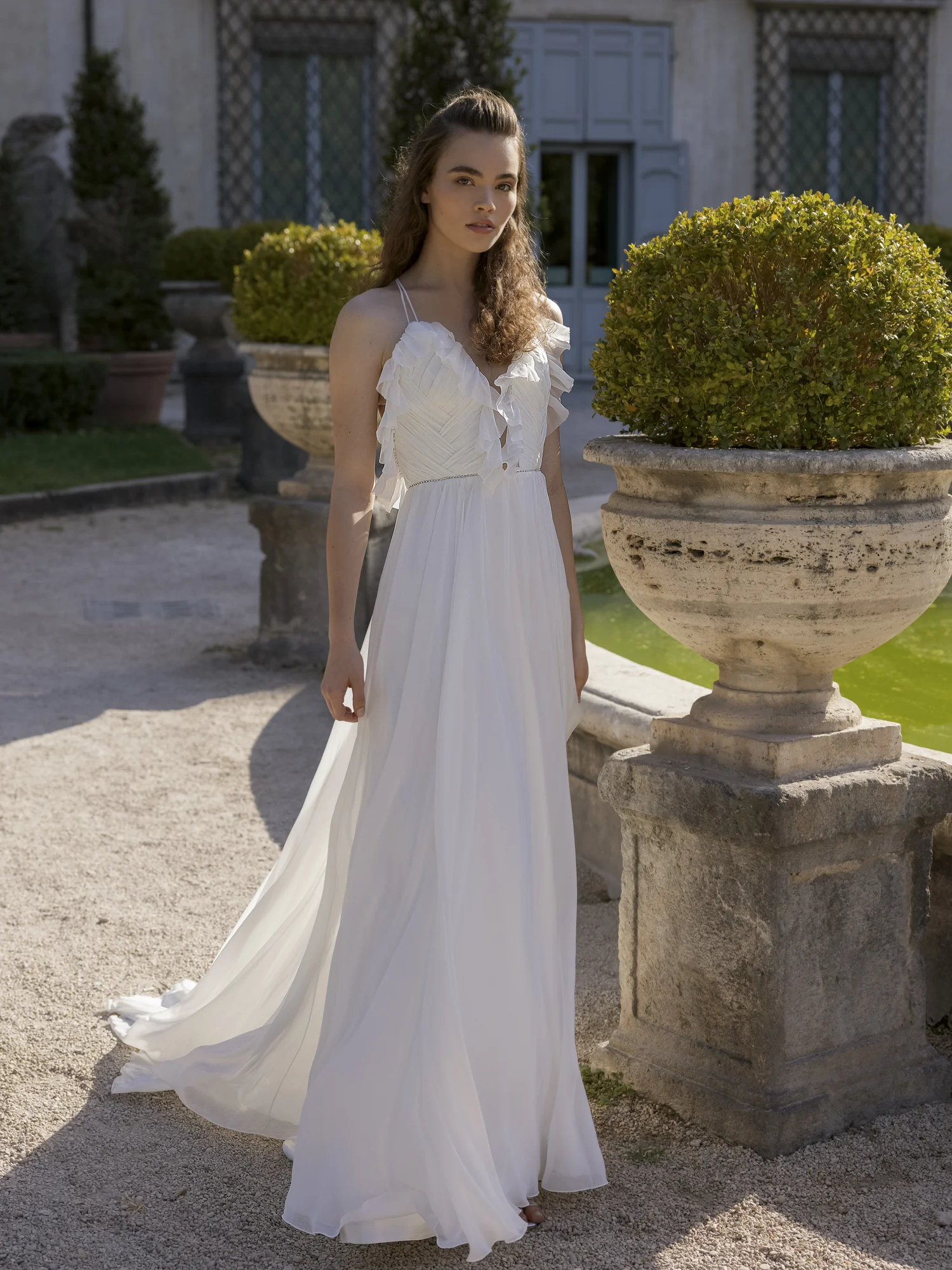 Свадебное платье PERLA прямого кроя с глубоким декольте. Лиф дополнен: корсетная посадка. Спинка: открытая спиная. Многослойная юбка из шифона. Доступные оттенки: молочный. Свадебное платье PERLA из коллекции Harmony of Love от Blamme Biamo доступно для покупки, проката и примерки в салоне MonPari в Гродно.