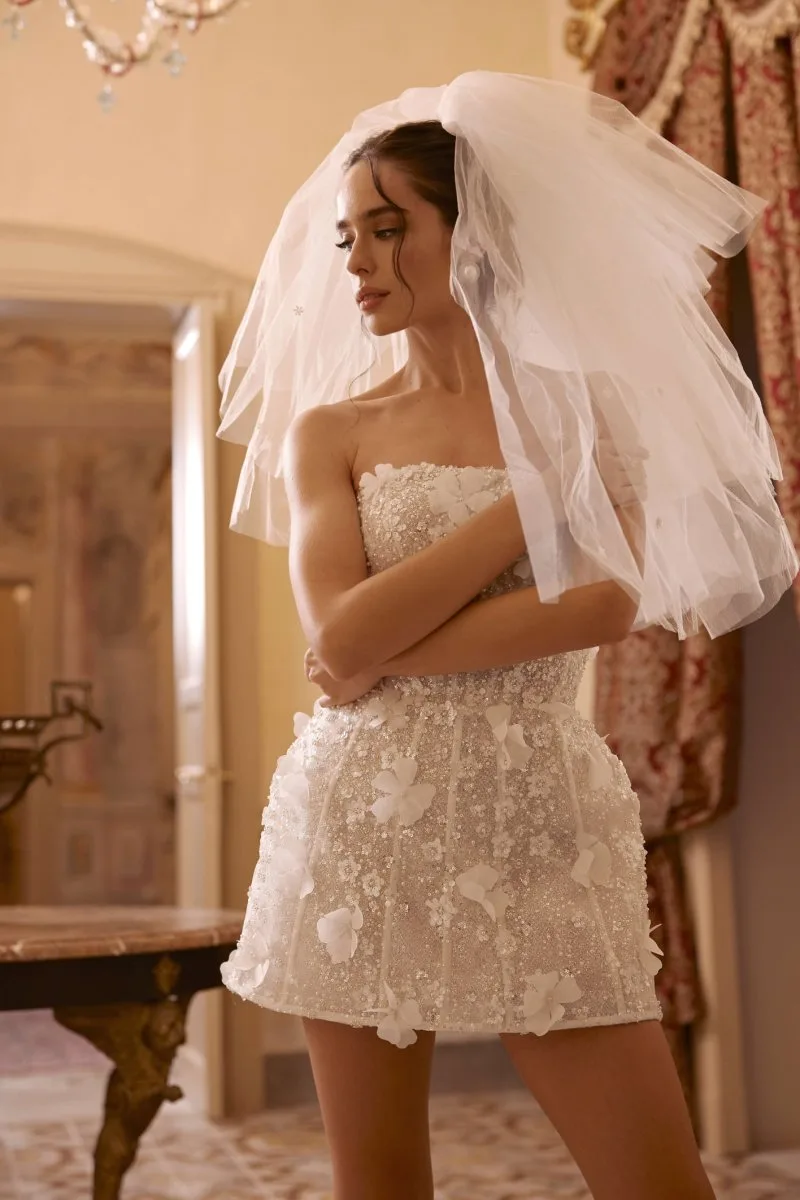 Свадебное платье RITA мини. Лиф дополнен: корсетная посадка, вышивка, отделка бисером и жемчугом, пайетки. Из кружева. Доступные оттенки: пудровый. Свадебное платье RITA из коллекции My Dear Lady от Rara Avis доступно для покупки, проката и примерки в салоне MonPari в Гродно.