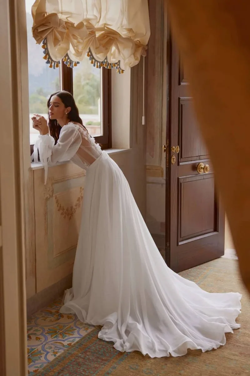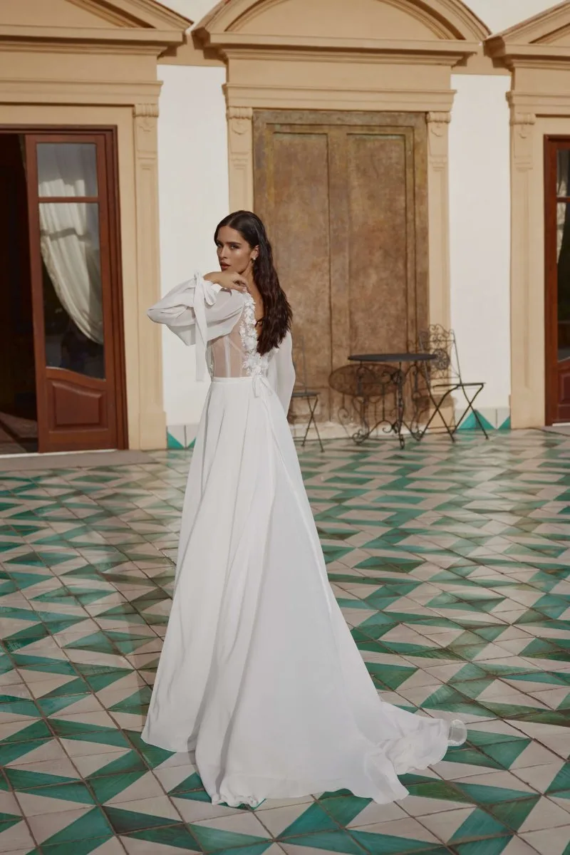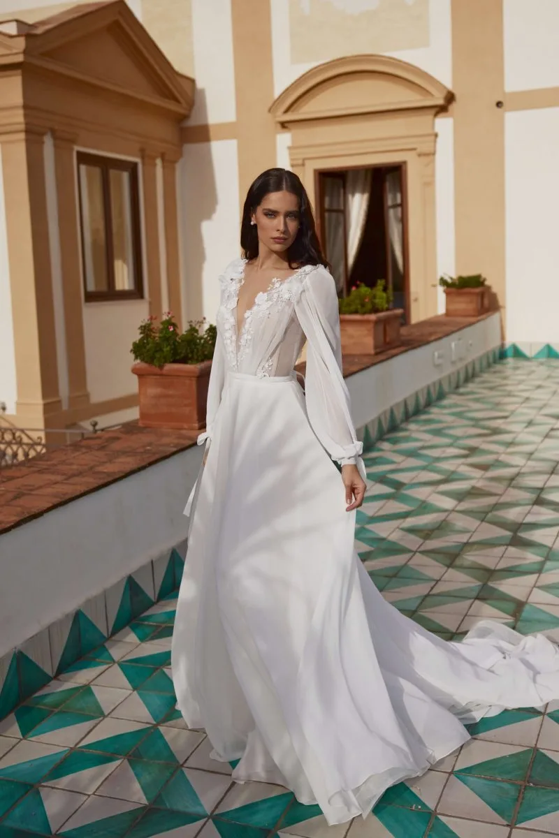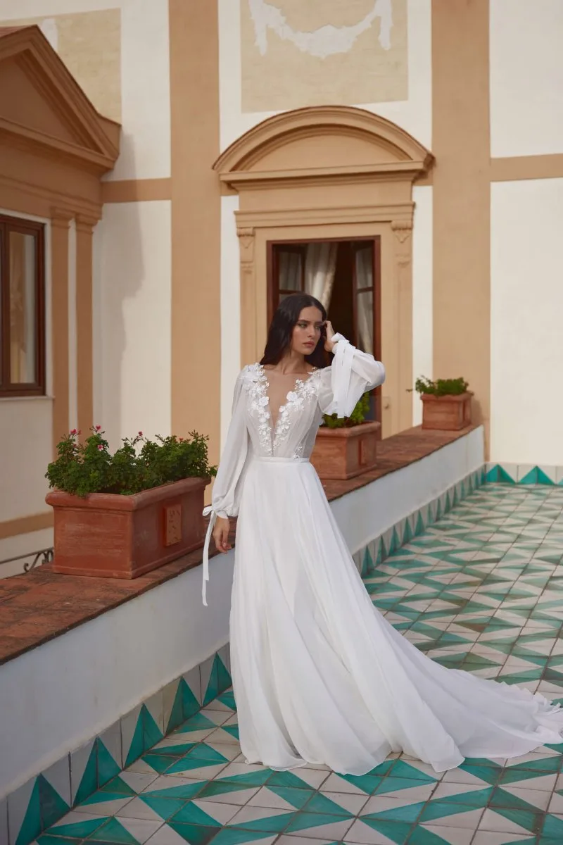 Свадебное платье SOFIA А-силуэта с V-образным вырезом. Лиф дополнен: цветочный декор. Из шифона. Особенности: шлейф. Доступные оттенки: молочный. Свадебный салон MonPari в Гродно приглашает на примерку платья SOFIA из коллекции My Dear Lady (Rara Avis). Покупка и прокат.
