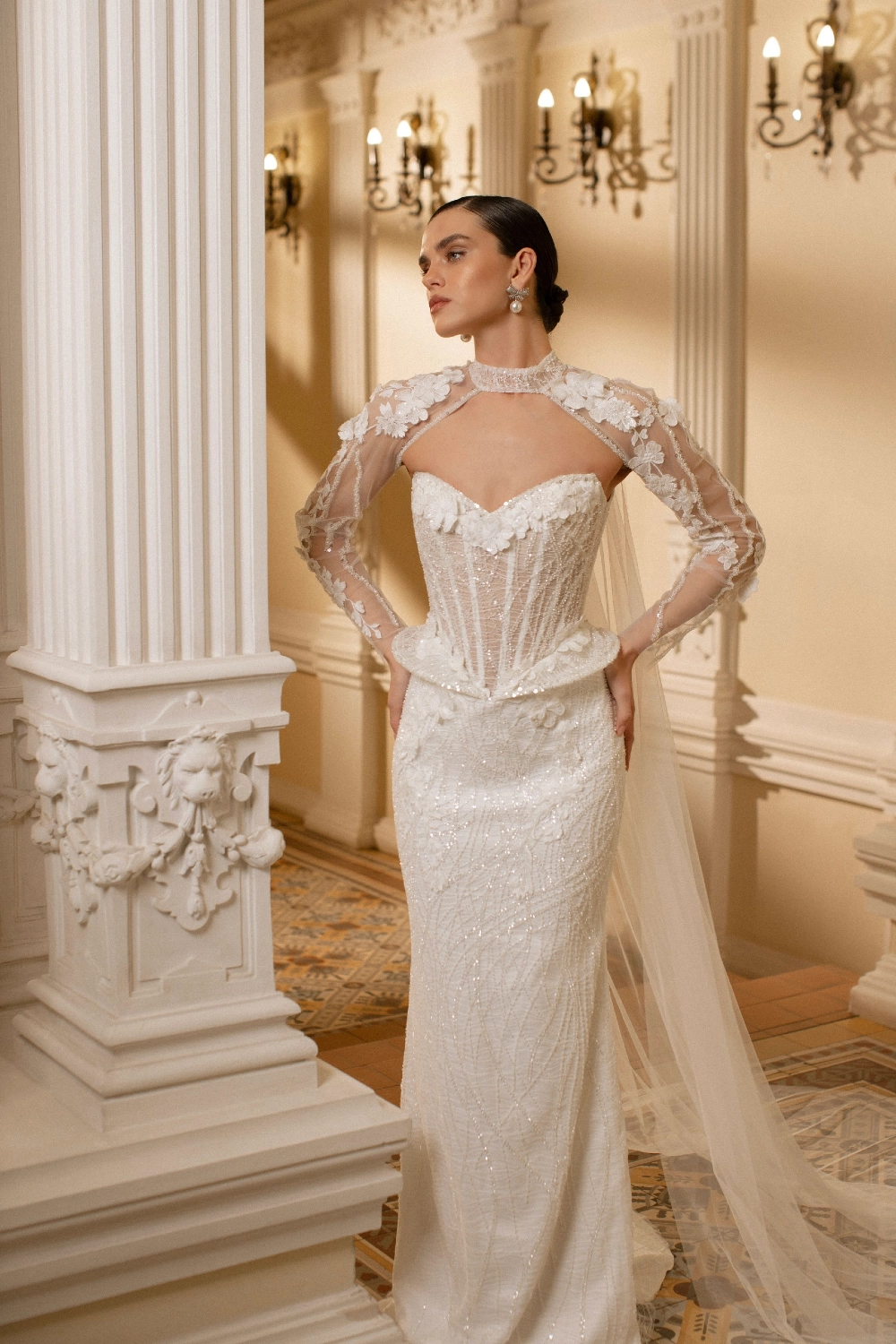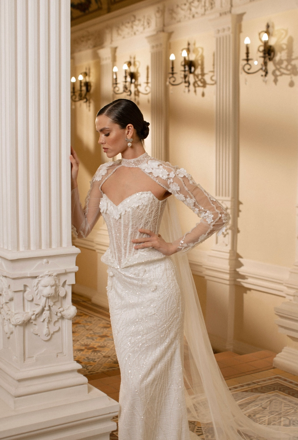 Свадебное платье TESAYA силуэта «русалка» с вырезом «сердечко». Лиф дополнен: корсетная посадка, вышивка, кружевная аппликация, отделка бисером и жемчугом. Спинка: шнуровкой на спине. Из кружева и атлас. Особенности: шлейф. Образ дополняют: кейп, полупрозрачные элементы. Доступные оттенки: молочный. Свадебное платье TESAYA из коллекции Love Poem от Blamme Biamo доступно для покупки, проката и примерки в салоне MonPari в Гродно.