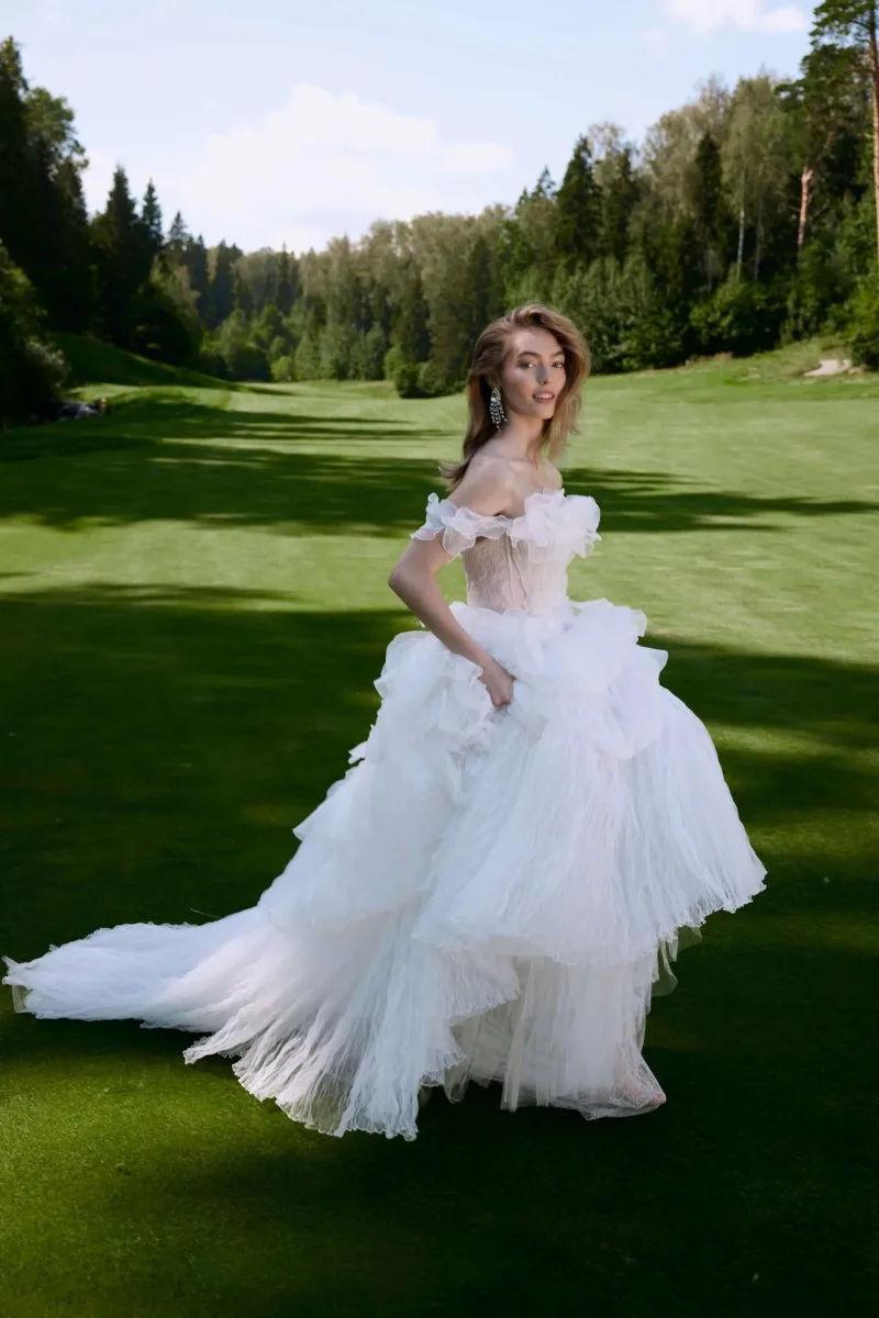 Свадебное платье TRAMONTANA силуэта «принцесса». Лиф дополнен: корсетная посадка, цветочный декор. Из сетка. Особенности: шлейф. Доступные оттенки: молочный. Свадебный салон MonPari в Гродно приглашает на примерку платья TRAMONTANA из коллекции Rose Des Vents (Rara Couture). Покупка и прокат.