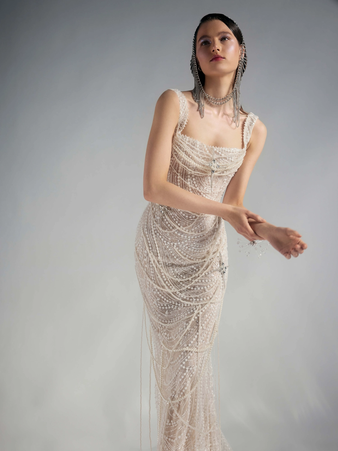 Свадебное платье VERSU А-силуэта. Лиф дополнен: корсетная посадка. Из кружева. Доступные оттенки: пудровый. Свадебное платье VERSU из коллекции L'horoscope от Rara Couture доступно для покупки, проката и примерки в салоне MonPari в Гродно.